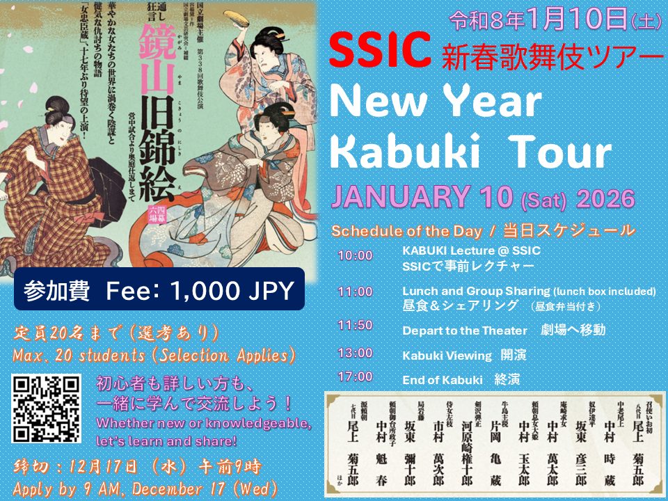 ・内容:[午前] SSICで歌舞伎レクチャー(講師:国際教養学部 Thompson先生)、参加者交流昼食(お弁当付き)。[午後] 劇場に移動して歌舞伎鑑賞
