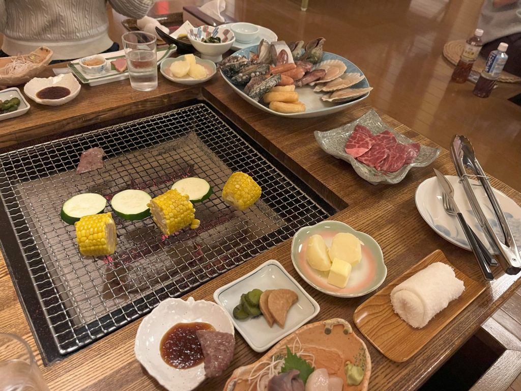 八雲町の産業をたくさん体験させていただいた後は、一日目の宿泊場所である「おぼこ荘」にて、囲炉裏体験をさせていただきました。囲炉裏を囲んだ夕食では、アワビの踊り食いなど、八雲町の海の幸を堪能することができました。またおぼこ荘の方々が作ってくださったお鍋もとても美味しく、一日目を振り返りながら、優しい味に癒されました!