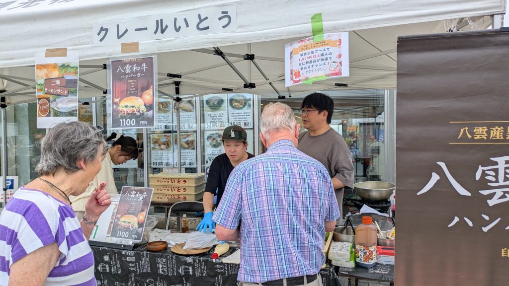 会場となったのは八雲町の噴火湾パノラマパーク。町をあげてのお祭りとあって、多くの来場者でにぎわい、地元ならではの特産品や食文化を楽しめる場となっていました。出展ブースは全部で10。1日目に訪問した服部醸造さんの味噌や醤油、漬物で知られる坂本食品さん、八雲和牛バーガーのクレールいとうさんなど、町を代表するお店が一堂に会し、来場者は思い思いに買い物や食事を楽しんでいました。