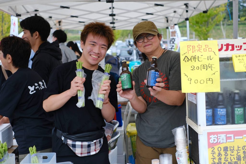 私は熊石観光協会さんのブースでお手伝いし、朝採れのアスパラガスや地元のクラフトビールを販売しました。新鮮なアスパラを手に取ったお客さんが「これが食べたくて来たんだ」と嬉しそうに話してくださり、売り子として対応しながらも地域の魅力が多くの人に愛されていることを実感しました。