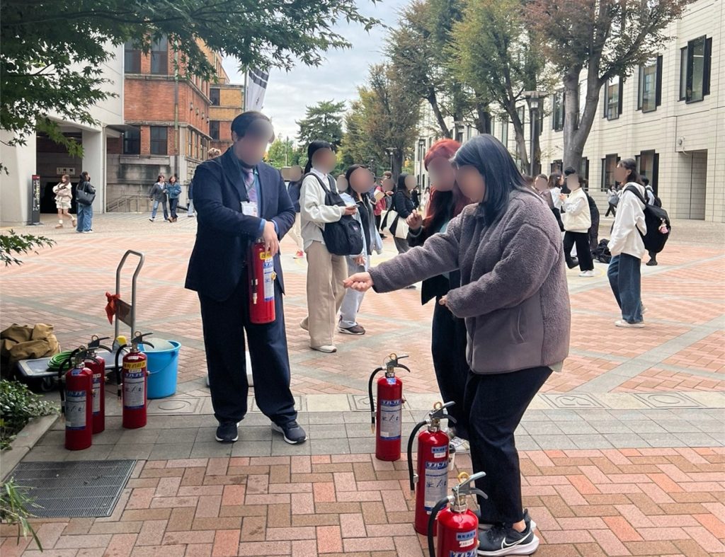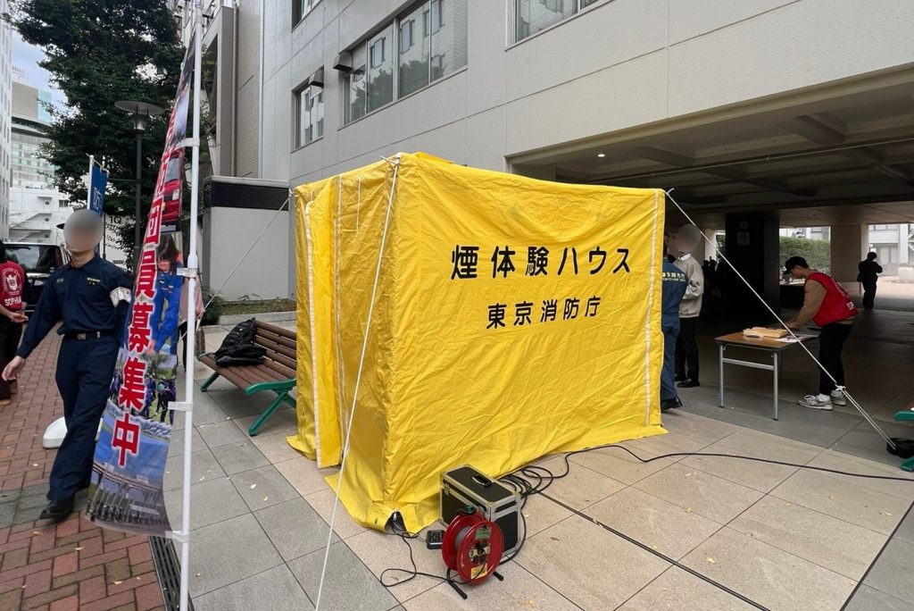 2日目は麹町消防署にご協力いただき、煙ハウス体験と消火器体験を実施しました。二つの箇所で実施することで、より多くの学生に参加できる機会を作れたと思います。煙ハウス体験では、煙があるテントに入ってもらい、障害物を避ける体験をしてもらいました。消化器体験では、水が入った消化器を操作していただき、普段使うことのない消化器を火災時に正しく、冷静に使用できるよう練習していただきました。