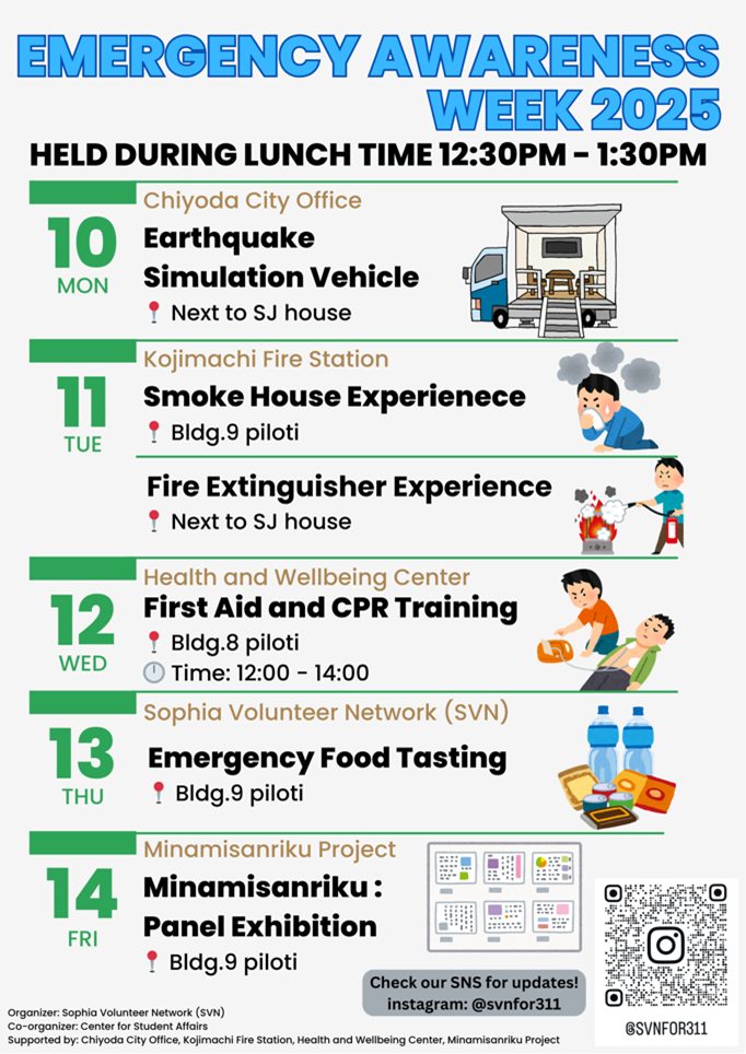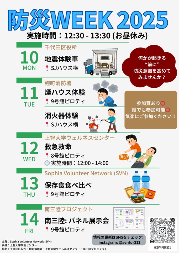 今回の「防災WEEK2025」を通じて、多くの学生や職員の方々に防災の重要性を伝えることができたと思います。災害時に求められる行動と知識を日本学生はもちろん、留学生の皆さんに学んでいただけていたら幸いです。そして、我々SVNは企画立案から実施に至るまでの難しさや達成感を味わい、大きく成長することができました。 最後に、協力してくださった麹町消防署、千代田区役所、上智大学ウェルネスセンター、南三陸プロジェクト、ボランティア・ビューローの皆様、そして参加者の皆様に改めて感謝申し上げます。この学びと経験が、私たち一人ひとりの防災意識を高めて、変わるきっかけとなることを願っています。