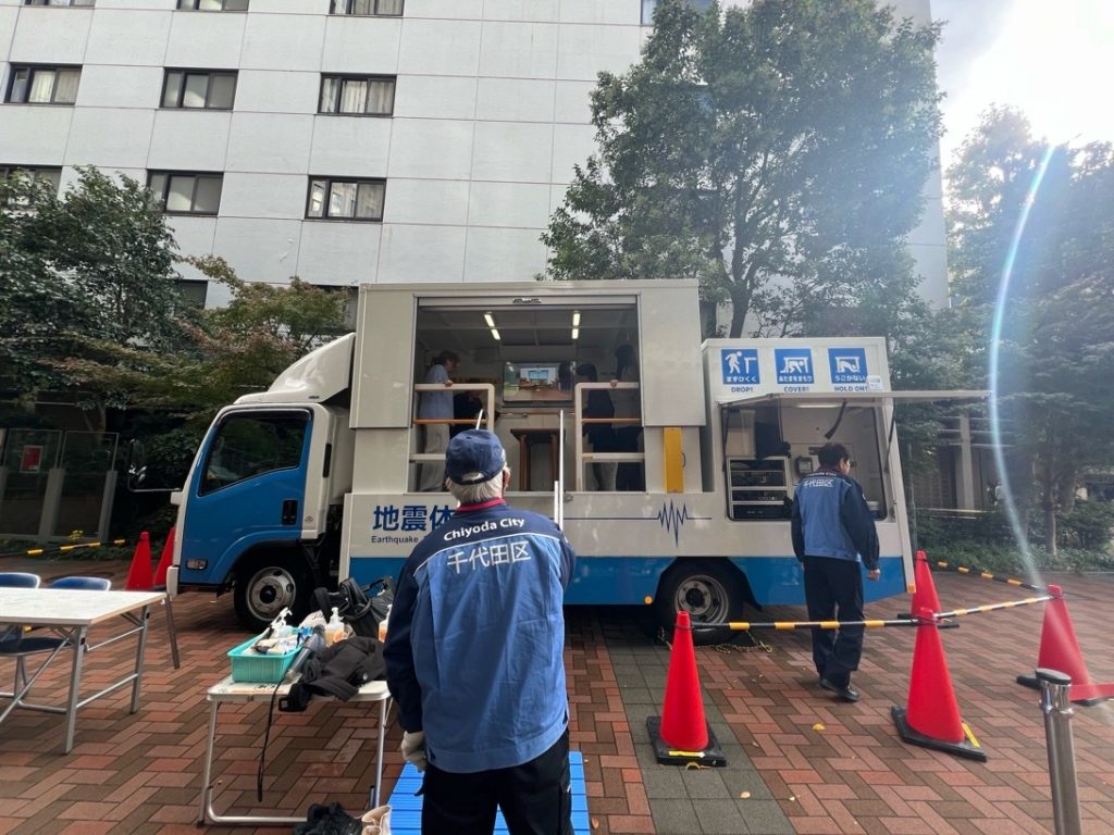 初日は千代田区のご協力のもと、「地震体験」を実施しました。学生の皆様には、最大震度7を想定した地震シミュレーションに参加していただきました。家具の固定や日頃の備えの重要性を改めて認識するきっかけとなったと思います。地震が多い日本でどのように対策したらいいか、身を守るために何ができるのか、防災意識を高める機会になっていたらいいと思います。