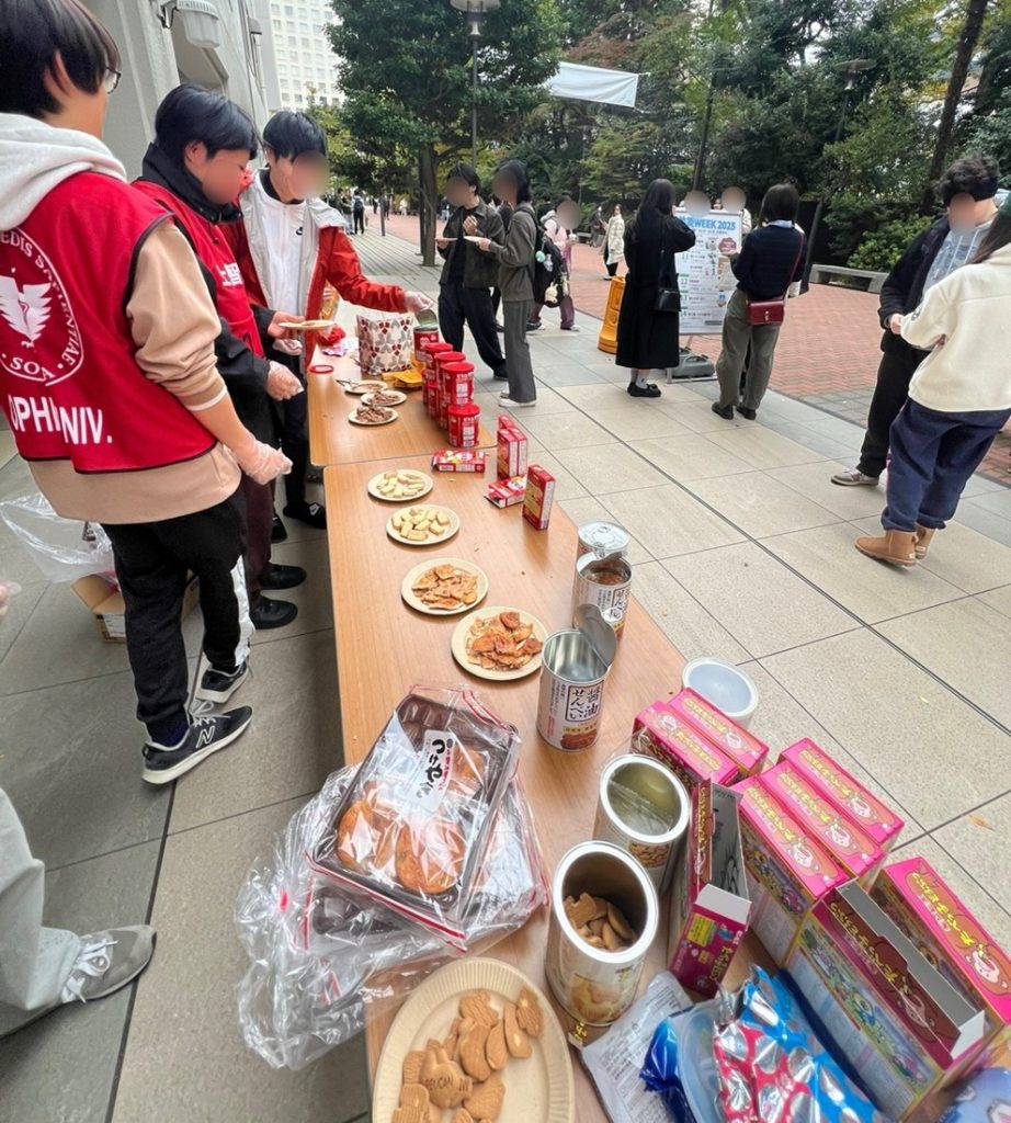 4日目には、「保存食食べ比べ」の体験を9号館ピロティーにて実施しました。参加者には、たべっ子どうぶつ、ビスコ、せんべい、カロリーメイトの4種類の保存食と通常食品を食べ比べてもらいました。見た目や味が変わらないことに驚く声が多く、本企画の目的であった保存食への壁をなくすことができてよかったです。今年はメインストリート沿いで実施したことによって、多くの学生に立ち寄ってもらうことができました。これを機に保存食の美味しさや備蓄の重要性を知るきっかけとなり、日常的な備えへとつながれば幸いです。