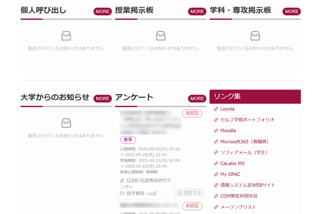 加えて、キャリア関係のような学内向けの情報もMy Sophia内で閲覧することができます。就職や大学院進学などキャリアについての情報は、基本的に学生向けの情報であって、学外に発信するものではありません。そのため、このような情報は、ログインしないと見ることのできない場所に置くほうが良いと考えています。