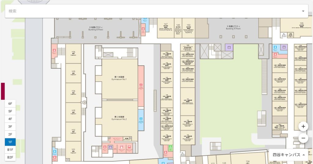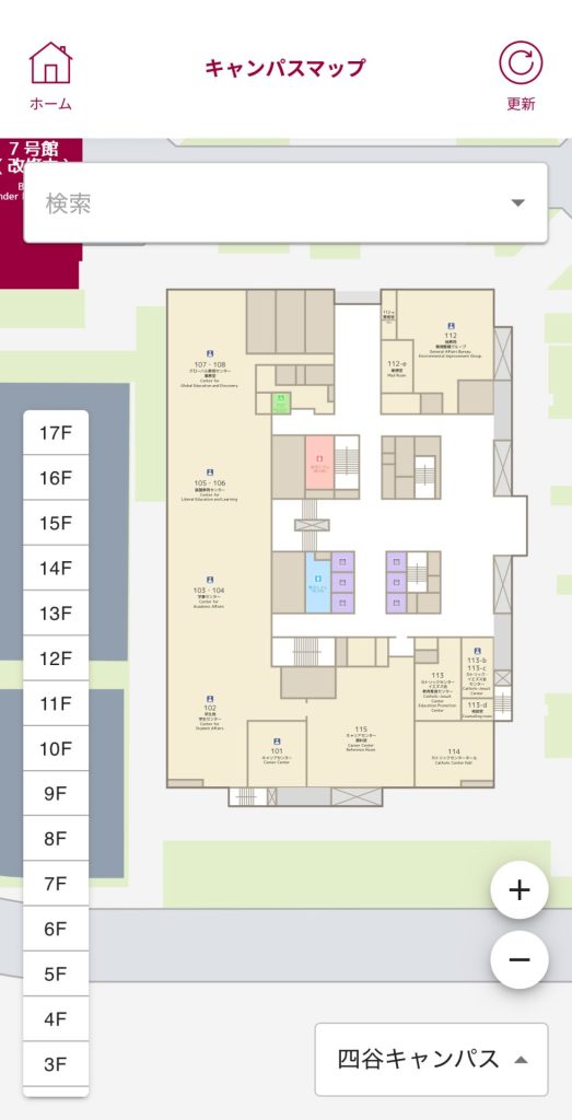 キャンパスマップ自体は使ったことがあっても、教室の位置まで見られることを知らない人は案外多いかもしれません。各建物(各号館)をタップすると、画像にあるように教室の位置が分かります! 左下に表示されているボタンから階の切り替えが可能です◎