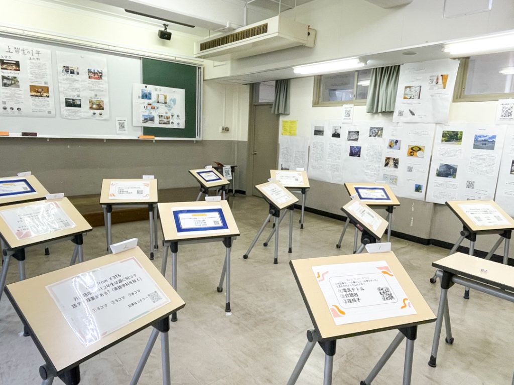 会場内に入るとまず目に留まるのは、教室二面の壁に装飾された記事展示です。