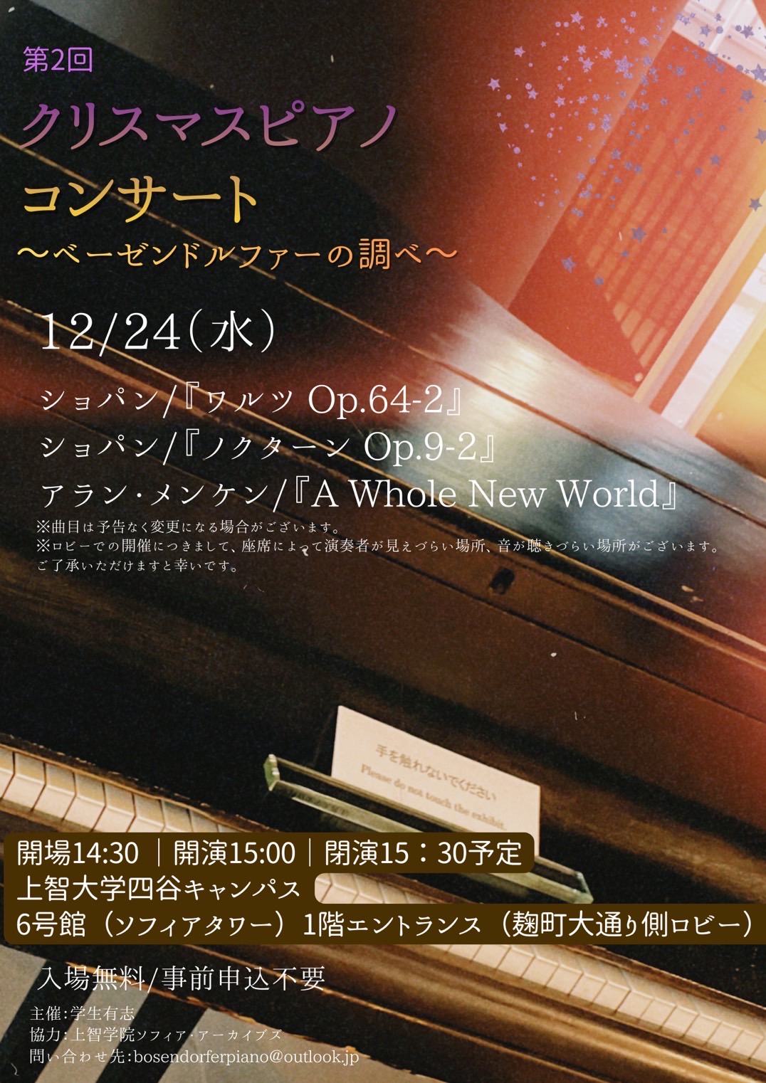 2025年12月24日(水)に、「第2回クリスマスピアノコンサート〜ベーゼンドルファーの調べ〜 」が開催されました。