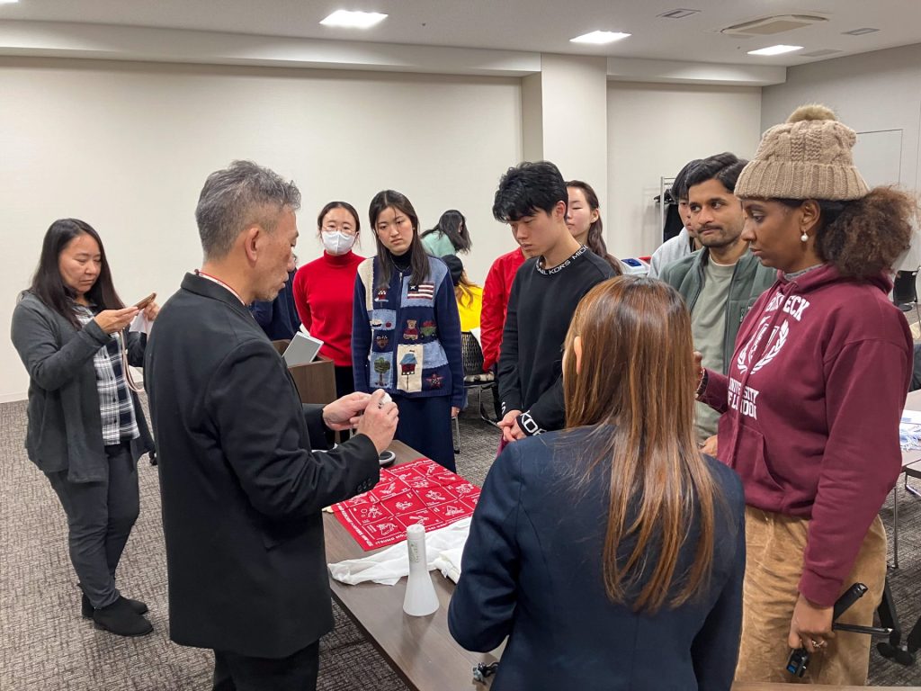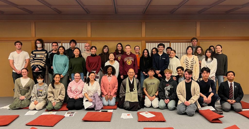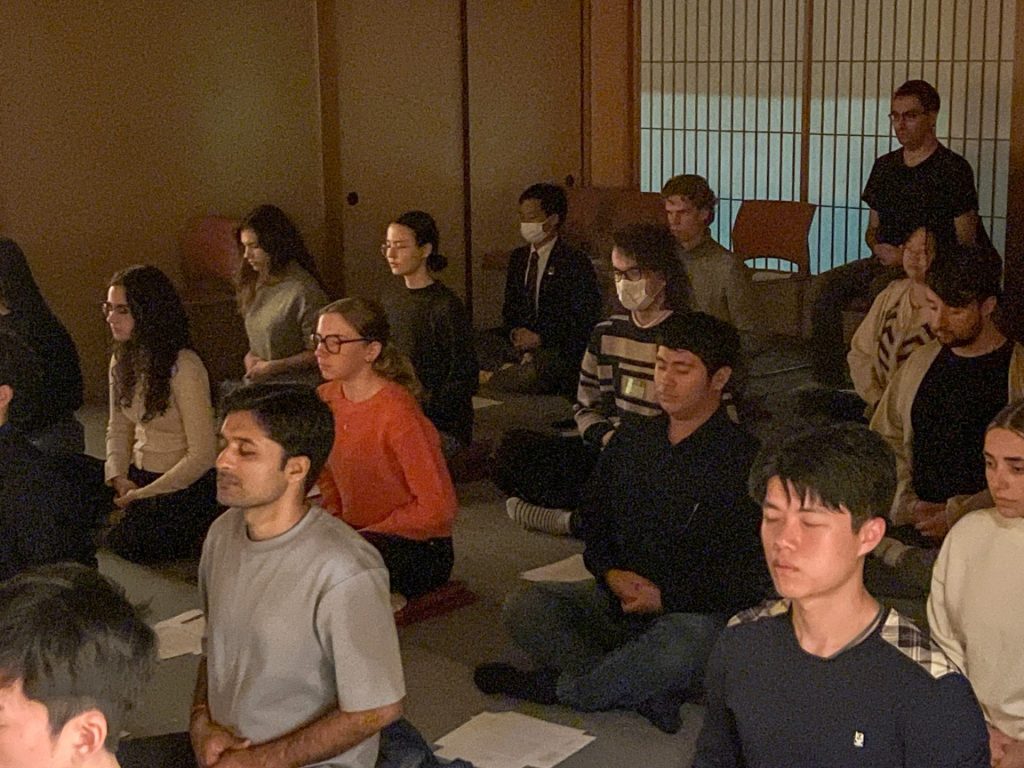 On October 24, We welcomedRev.DaikoMatsuyama, Deputy Head Priest of Taizō-in, a sub-temple of Myōshin-ji in Kyoto, to Kioi-tei, located on the university’s campus. Rev. Matsuyama has been active internationally, engaging in interfaith dialogue and sharing insights on Zen Buddhism through meetings with His Holiness the 14th Dalai Lama, lectures at the Foreign Correspondents’ Club of Japan and various embassies, and participation in the World Economic Forum’s Annual Meeting in Davos. This visit offered a valuable opportunity for participants to receive direct instruction in Zazen from Rev.Matsuyama.